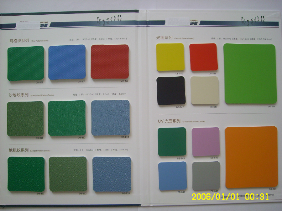 本公司pvc塑膠地板為卷材,產(chǎn)品顏色、紋路、厚度多樣,有3.5mm-4.5mm的紅色、綠色、灰色、黃色、湖藍(lán)色、深藍(lán)色荔枝紋,3.5mm天藍(lán)光面、4.5mm楓木紋、4.5mm砂礫紋、4.5mm水晶砂等。